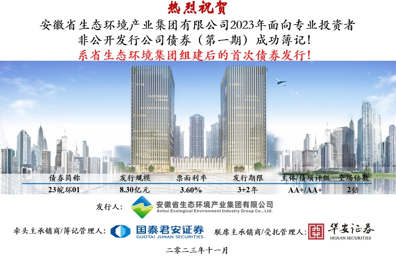 11月24日,省生態環境集團首單非公開公司債券(債券簡稱:23皖環01,債券代碼:253104.SH)在上海證券交易所成功簿記發行,本次債券由國泰君安、華安證券主承銷,募集金額8.3億元,期限3+2年,票面利率3.60%,圓滿完成集團掛牌以后在資本市場的首次亮相。