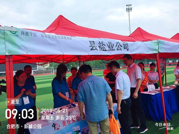 按照統(tǒng)一部署,6月21日早晨,長(zhǎng)豐縣鹽業(yè)公司5名工作人員早早就來到了活動(dòng)現(xiàn)場(chǎng),帶著《食鹽專營(yíng)辦法》等宣傳資料、品種鹽樣品及訂制的水杯參加宣傳活動(dòng)。啟動(dòng)儀式開始后,首先由縣政協(xié)副主席致辭;接著是合肥伊利乳業(yè)有限責(zé)任公司代表食品生產(chǎn)企業(yè)作承諾發(fā)言;最后由縣人大副主任宣布“長(zhǎng)豐縣2019年食品安全宣傳周暨食品安全長(zhǎng)豐行活動(dòng)正式啟動(dòng)”并會(huì)同場(chǎng)上領(lǐng)導(dǎo)共同按下儀式啟動(dòng)球。活動(dòng)現(xiàn)場(chǎng)人群涌動(dòng),氣氛熱烈,長(zhǎng)豐公司5名工作人員穿著統(tǒng)一T恤,佩戴著工作證,分別在兩個(gè)展臺(tái)開展宣傳。主要宣傳《食鹽專營(yíng)辦法》、講解多品種鹽知識(shí),推崇“吃好鹽 選中鹽”,吃鹽首選“綠色食品鹽”的健康理念。