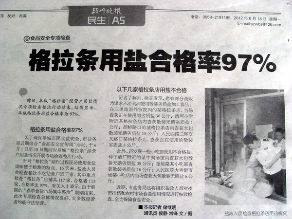 《潁州晚報》:格拉條用鹽合格率97%