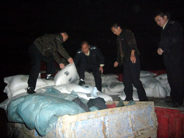 當日夜,市鹽務局鹽政科接群眾舉報,稱有人在聞集鎮兩河口附近交易工業鹽。潁泉鹽政聯系聞集派出所協助。在聞集鎮兩河口附近的河壩上,執法人員發現有人正在從贛籍紅色解放牌大貨車上往機動三輪車上卸白色袋裝物。執法人員控制了現場人員和車輛,經清點貨車上載有標注“元明粉”的白色塑編袋鹽產品共計360包,約18噸,鹽產品經現場碘試劑測試不含碘。